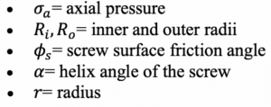 This integral is generally solved using numerical methods; however, for practical design purposes, an approximate solution is often adopted to simplify calculations while maintaining acceptable accuracy. Because screw geometry typically varies along its length, the overall torque must be determined by summing the contributions from each individual section. In addition to the torque generated by the screw flights, frictional resistance between the bulk material and the screw shaft also adds to the total torque. This shaft-related torque is calculated for each pitch segment and then combined with the blade torque to obtain the complete torque requirement for the feeder.