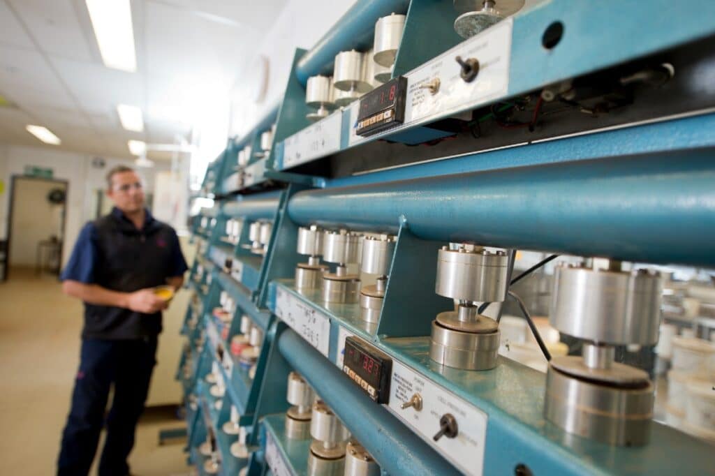 A recent project undertaken by TUNRA Bulk Solids involved the conceptual design of a mass flow hopper and multiple screw feeders for handling fine fertiliser material. The design process began with a comprehensive evaluation of the material’s flow characteristics under worst-case conditions. Initial testing focused on determining the maximum moisture content likely to occur during storage. This moisture level was then used for detailed flow property testing, including wall friction, internal friction, and flow function measurements. In addition, time storage testing was conducted to assess the effect of prolonged, undisturbed storage on bulk strength.