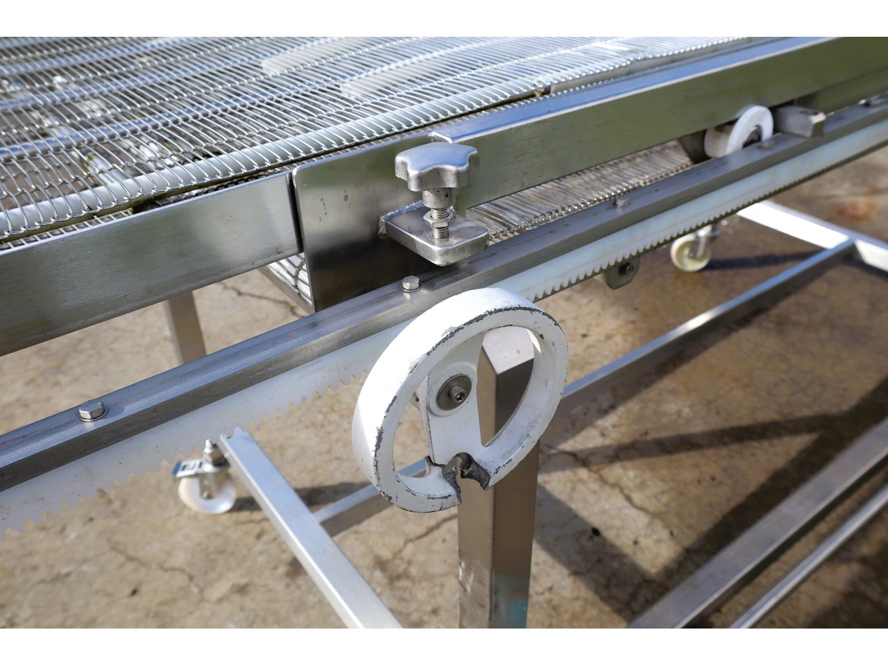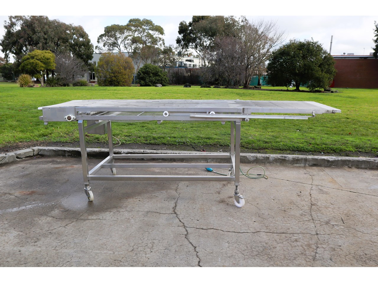 This conveyor is in great working condition. The travel length of the conveyor can be extended manually and the belt is made out of stainless steel chain links.